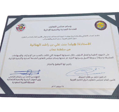 In particular, she was awarded in 2006 the Order of His Majesty the King of Bahrain as one of the “Distinguished Arab Women” during the first Arab Women’s Summit organized by the Arab League in Bahrain.